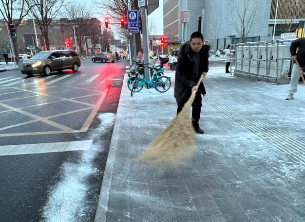 下昼4点30分,通州区西海子南路,通州区体育局门前东谈主行便谈已积起了薄薄一层白雪。“咱们单元规矩的扫雪边界是西海子南路东口到西海子公园门口,一共200米。”通州区体育局副局长李凤苹示意,单元早就也曾提前准备好了雪铲、扫把等扫雪铲冰器具,唯一大地见白,坐窝号令单元责任主谈主员外出扫雪。
